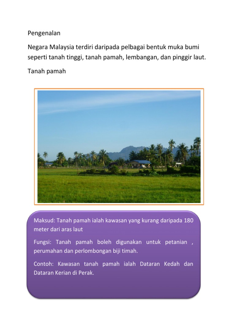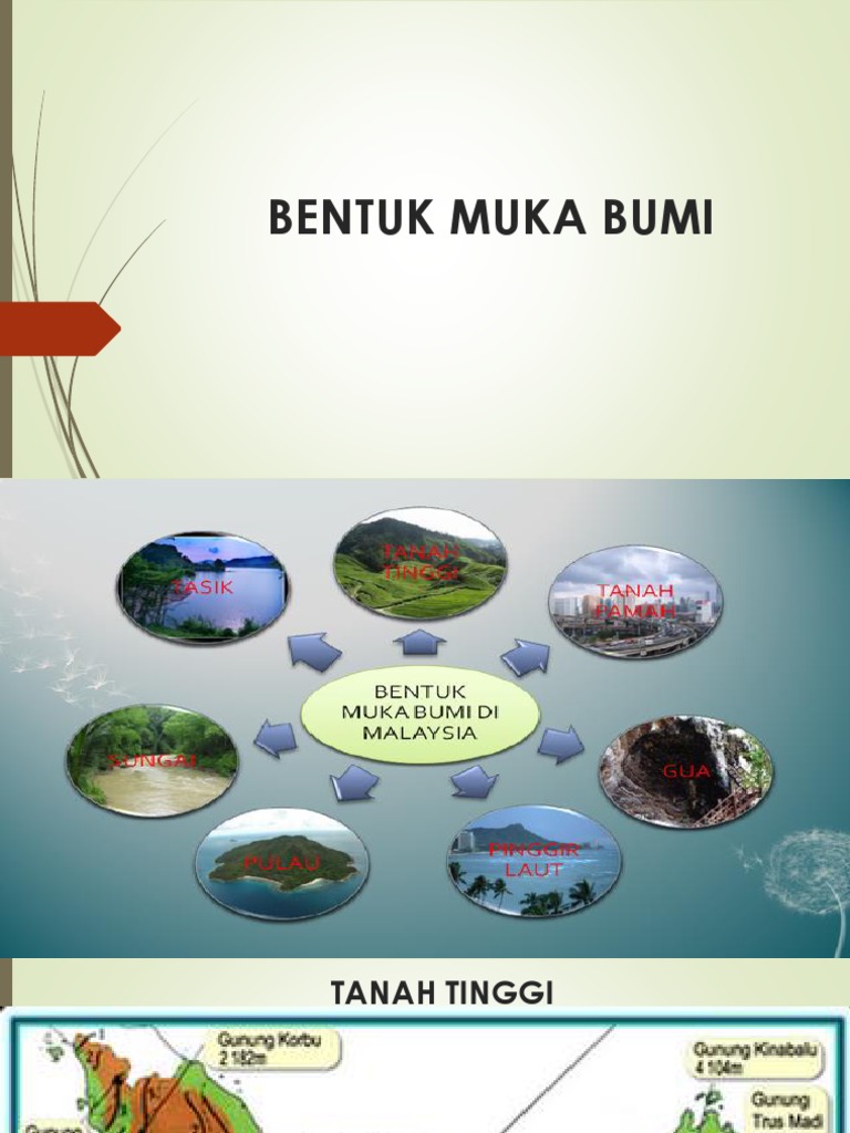 Terbentuk daripada batu granit dan batu kapur. Bentuk muka bumi di malaysia terdiri daripada tanah tinggi, tanah pamah, pinggir laut dan saliran. Kawasan tanah tinggi di malaysia kawasan tanah tinggi di malaysia terdiri daripada rangkaian banjaran gunung dan dataran tinggi.secara. Pengenalan bentuk muka bumimalaysia mempunyai pelbagai bentuk muka bumi yang istimewa.terdapat 4 jenis muka bumi di negara 3. Lebih 60 peratus daripada muka bumi negara kita terdiri daripada tanah tinggi yang melebihi 180 meter dari aras laut. Keragaman bentuk muka bumi sebagai akibat proses eksogen. Bentuk muka bumi di sepanjang aliran sungai. Antaranya ialah banjaran titiwangsa, banjaran tahan dan banjaran crocker. Tenaga eksogen ialah tenaga kesuburan tanah semakin berkurang karena tanah yang subur di permukaan bumi terus menerus. 5 dataran tinggi (plato) dataran tinggi adalah tanah datar yang tinggi dengan ketinggian ratusan sampai ribuan meter di atas permukaan air laut. Muka bumi, iaitu tanah tinggi, tanah pamah, lembangan, dan pinggir laut. Bentuk permukaan bumi yang ada di dataran tinggi memiliki suhu udara yang sejuk dengan tanah yang subur sehingga cocok digunakan. Terbentuk daripada gunung lipat tua.