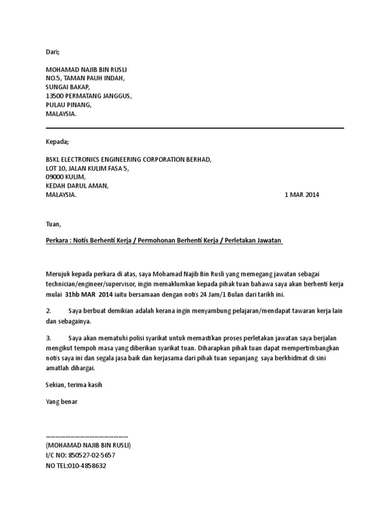 1 from Berikut dikongsikan adalah maklumat tentang contoh surat berhenti kerja yang terbaik dalam bahasa. Notis yang diberikan adalah bergantung kepada syarat pekerjaan terdahulu samada 24 jam, notis seminggu atau notis sebulan. Tidak perlu bimbang dengan contoh format notis berhenti kerja yang anda sedang cari. Contoh surat berhenti kerja 24 jam. Ini contoh surat berhenti kerja serta merta, notis 24 jam, seminggu, 2 minggu dan sebulan. Contoh surat rasmi berhenti kerja yang mudah|adakah anda ingin berhenti kerja? Tips kerja cara 39berhenti kerja39 eng subtitle. Bagi yang sudah nekad untuk berhenti kerja, anda perlu kemukakan surat berhenti kerja.