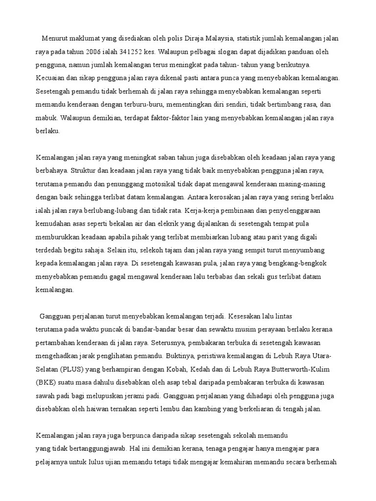 Lpi Sat Essay Help from 4.bp.blogspot.com Selain itu, kemalangan jalan raya juga berpunca daripada pertambahan bilangan kenderaan. Karangan kemalangan jalan raya kemalangan jalan raya yang berlaku di negara ini meningkat dari semasa ke semasa. Daripda itu, masalah ini haruslah diberi perhatian daripada pelbagai pihak. Kadar kemalangan di jalan raya telah meningkat dari semasa ke semasa. Contoh karangan cara atau langkah mengatasi kemalangan jalan raya pendahuluan dasawarsa ini, sama ada kita sedar atau tidak lantaran terlalu dihidangkan dengan pembangunan negara yang semakin gah di persada dunia. Kemalangan jalan raya faktor usaha isu nahas atau kemalangan dan kematian di jalan raya sudah menjadi masalah negara yang sering menghantui kita setiap hari. Antara punca utama kemalangan tersebut adalah disebabkan kecuaian pemandu. Kemalangan jalan raya berpunca daripada kecuaian manusia.