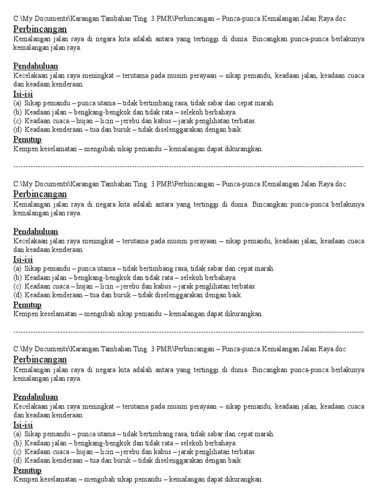 Koleksi untuk rujukan upsr soalan peperiksaan nota jawapan latihan rujukan upsr. For more information and source, see on this link : Tragedi ini berpunca daripada beberapa faktor. Kemalangan di jalan raya menyebabkan ahli keluarga kehilangan anggota yang tersayang. Perangkaan pihak polis trafik juga menunjukkan bahawa lebih daripada 95 peratus kes kemalangan jalan raya berpunca daripada kecuaian pemandu kenderaan. For more information and source, see on this link : Belakangan ini sering berlaku kemalangan di negara kita. Terdapat kajian yang mengatakan bahawa faktor manusia merupakan faktor tunggal dalam 57% daripada kemalangan jalan raya. Selain daripada faktor manusia, keadaan fizikal jalan raya yang tidak memuaskan turut membawa kepada kemalangan jalan raya. • keadaan kenderaan yang kurang baik. Kemalangan jalan raya memang sukar ditangani sepenuhnya. Sehingga akhir tahun 1996 sebanyak 7 686 684 buah kenderaan didapati aktif di atas jalan raya daripada jumlah itu motosikal mencatat jumlah yang tertinggi dengan 3 951 937 buah diikuti kereta 2 889 536 buah kenderaan awam dan sebagainya dengan pertambahan ini maka kekerapan kemungkinan dan. Faktor utama berlakunya kemalangan jalan raya ialah kecuaian pemandu.